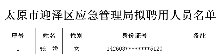 根據(jù)《太原市迎澤區(qū)應急管理局招聘公告》有關規(guī)定,公開招聘工作人員體檢已結束,現(xiàn)對擬聘用人員名單進行公示,公示時間為3個工作日。